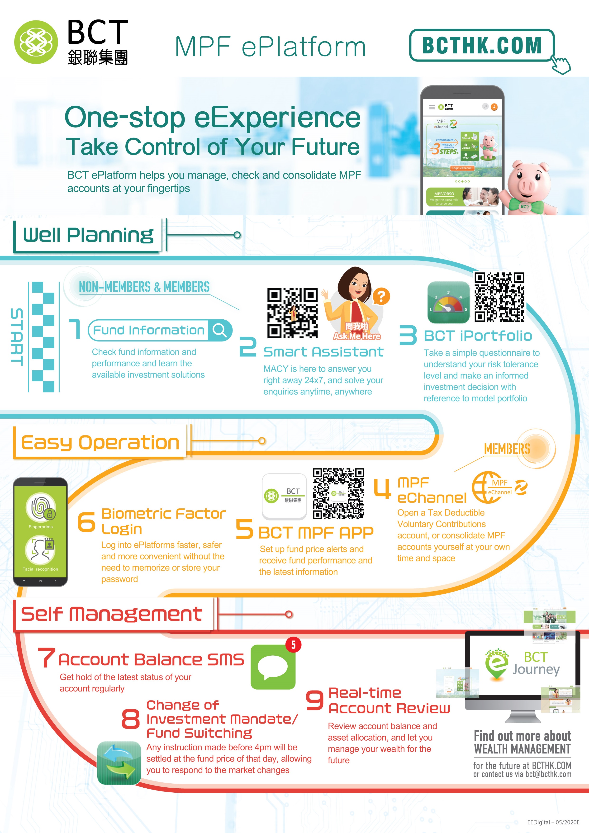BCT ePlatform helps you manage, check and consolidate MPF accounts at your fingertips. Click here to view the eJourney@BCT at a Glance