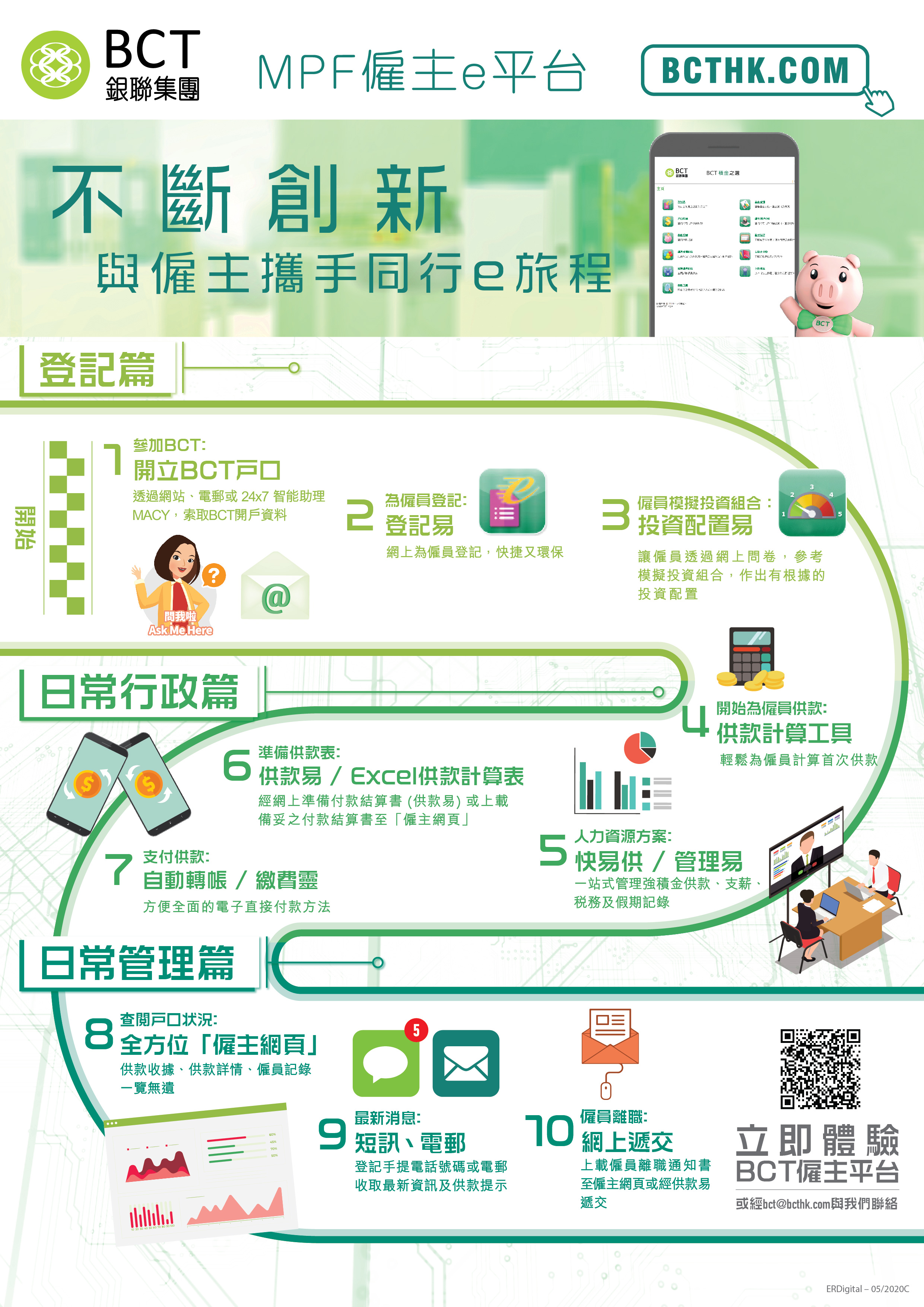 BCT e平台助你輕鬆管理 MPF戶口,檢視、處理,無難度,智能助理MACY隨時隨地為你解答疑難!按此一圖盡覽BCT的e旅程。